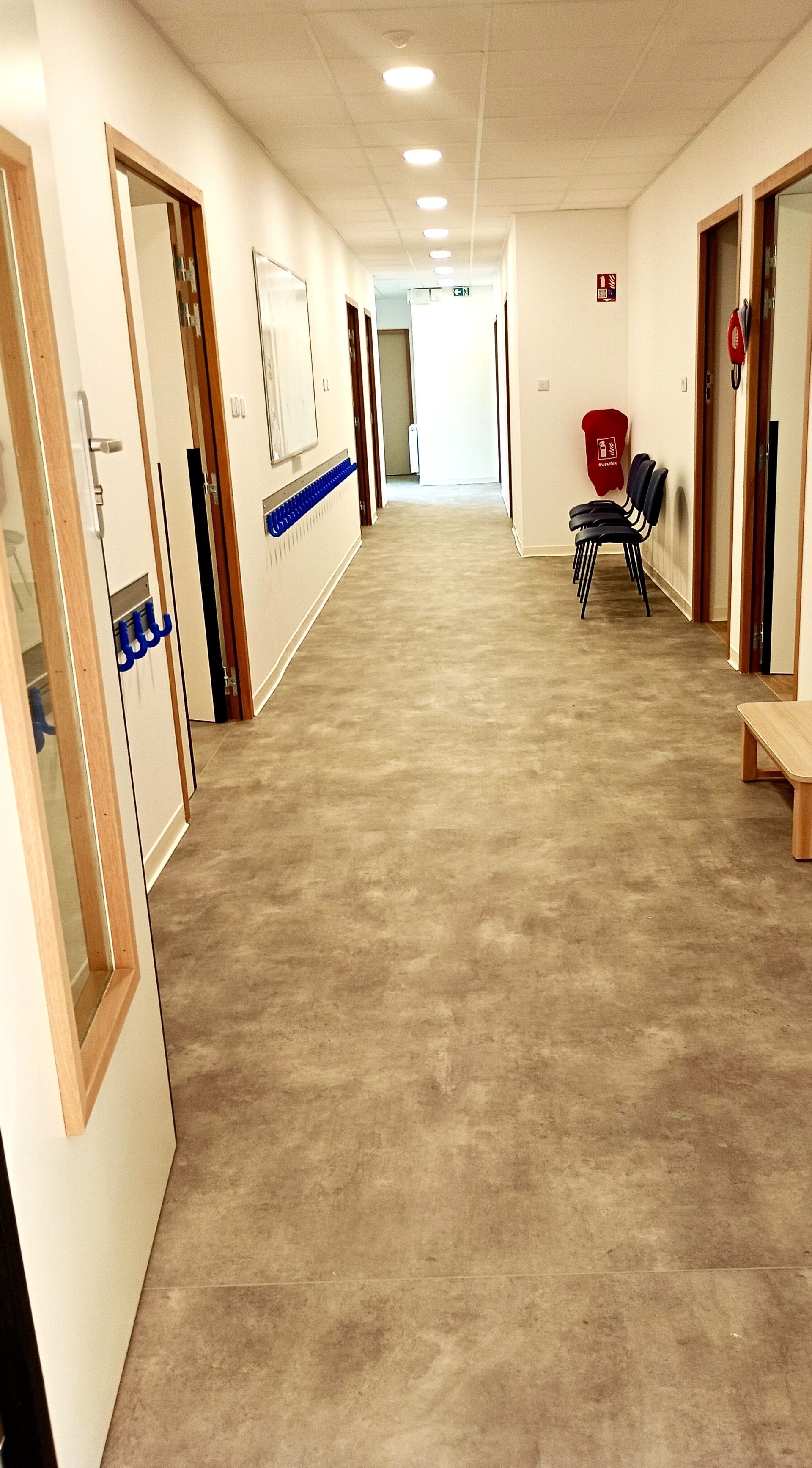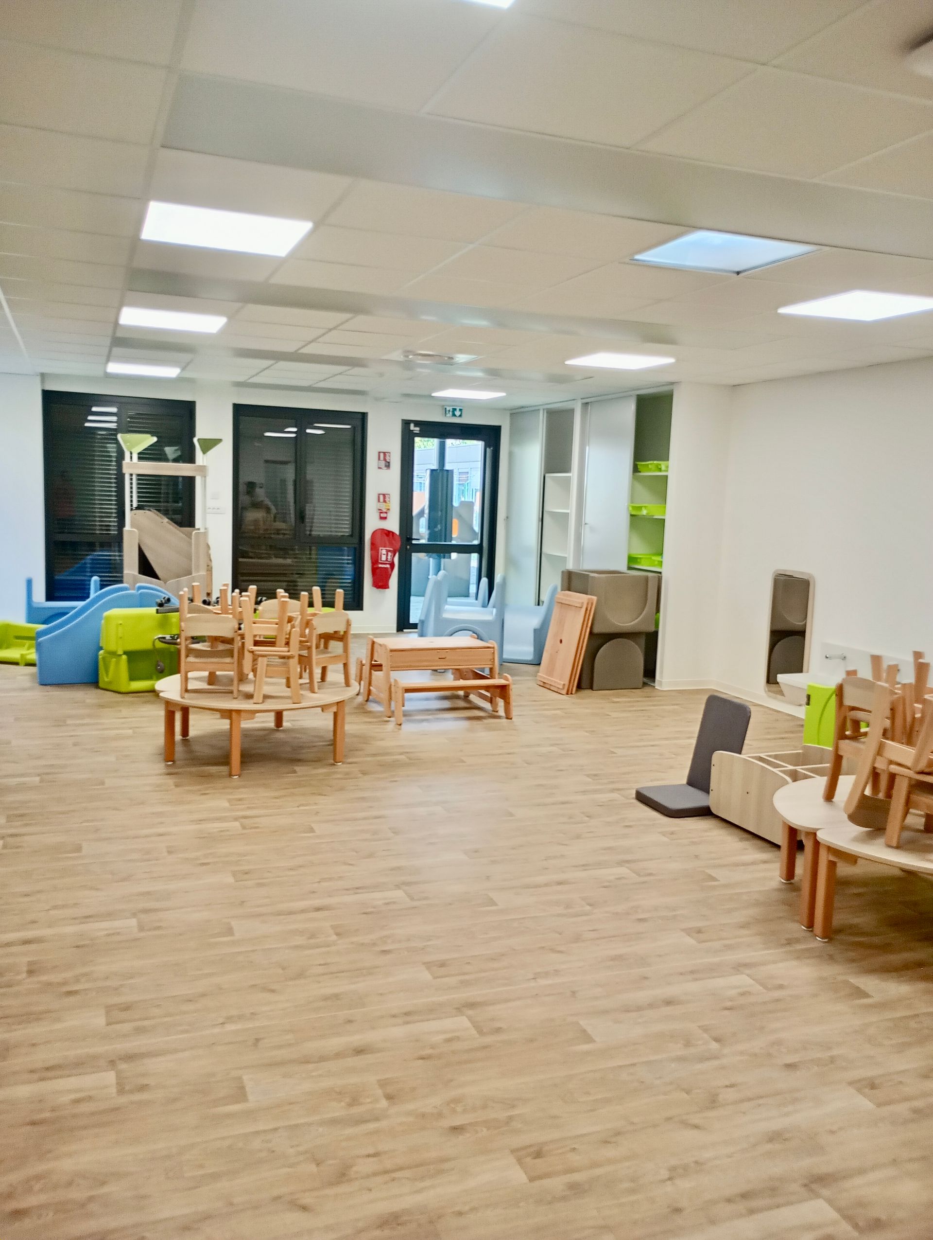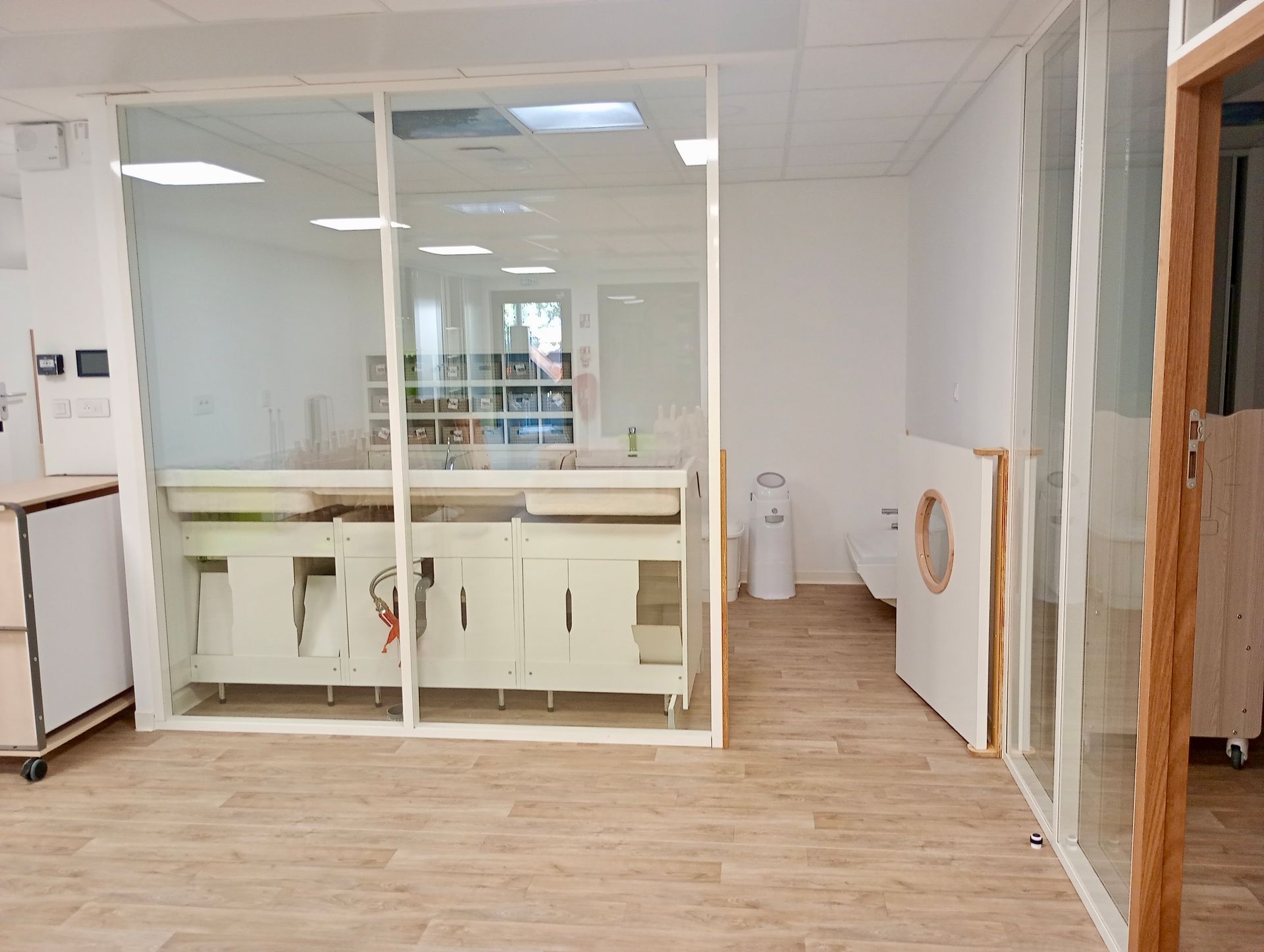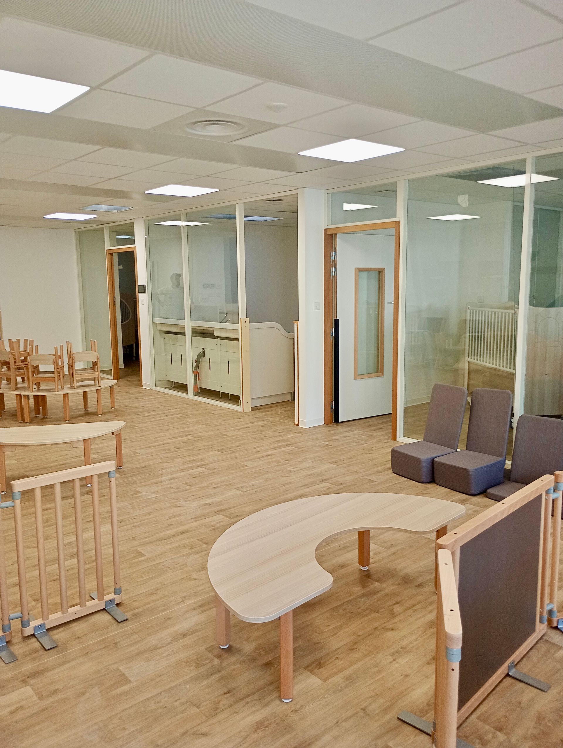 Réalisation des travaux de cloisons placostil , cloisons modulaires vitrées, doublages, plafonds, peintures et pose de blocs-portes pour la construction d'une crèche.