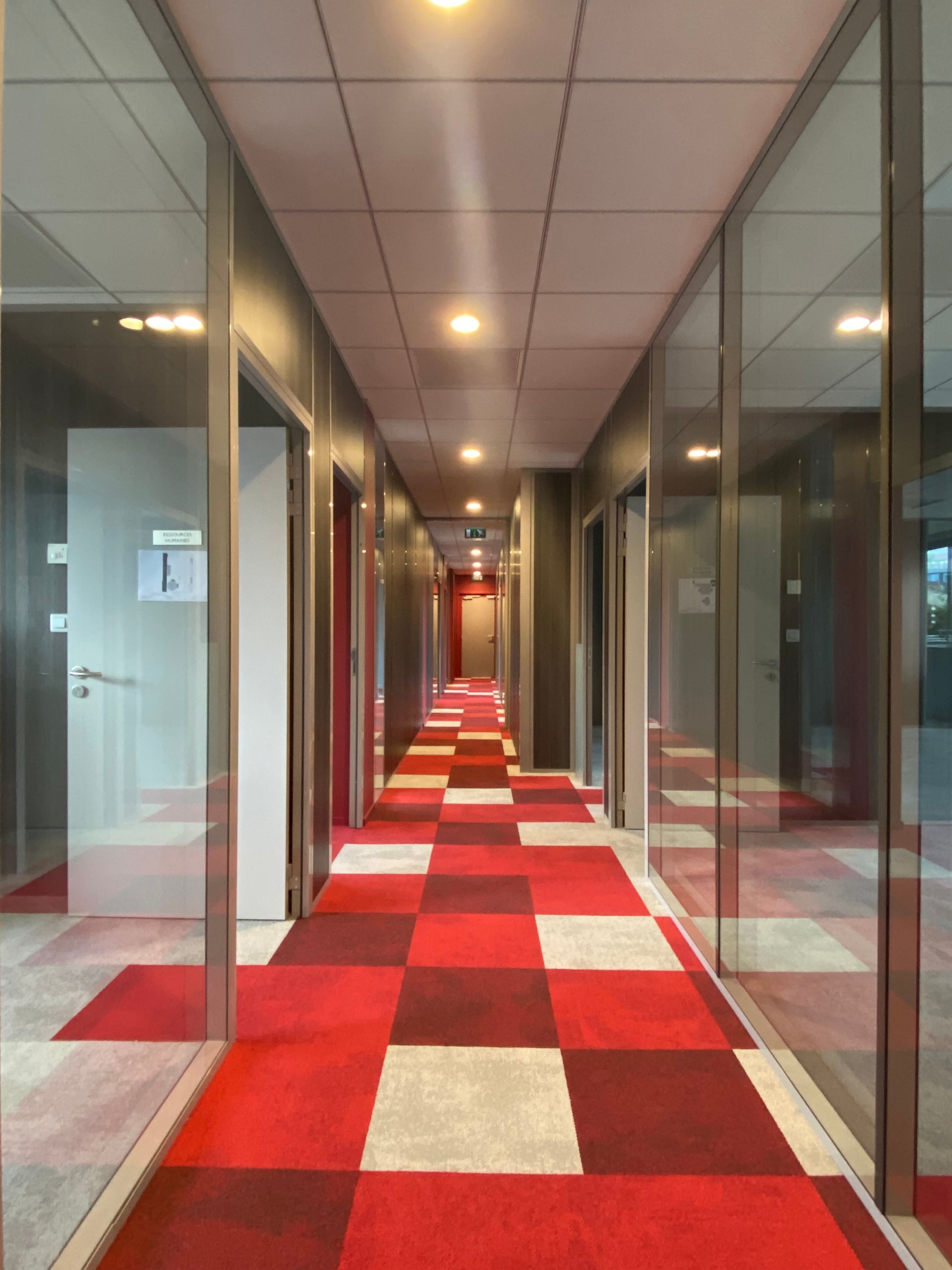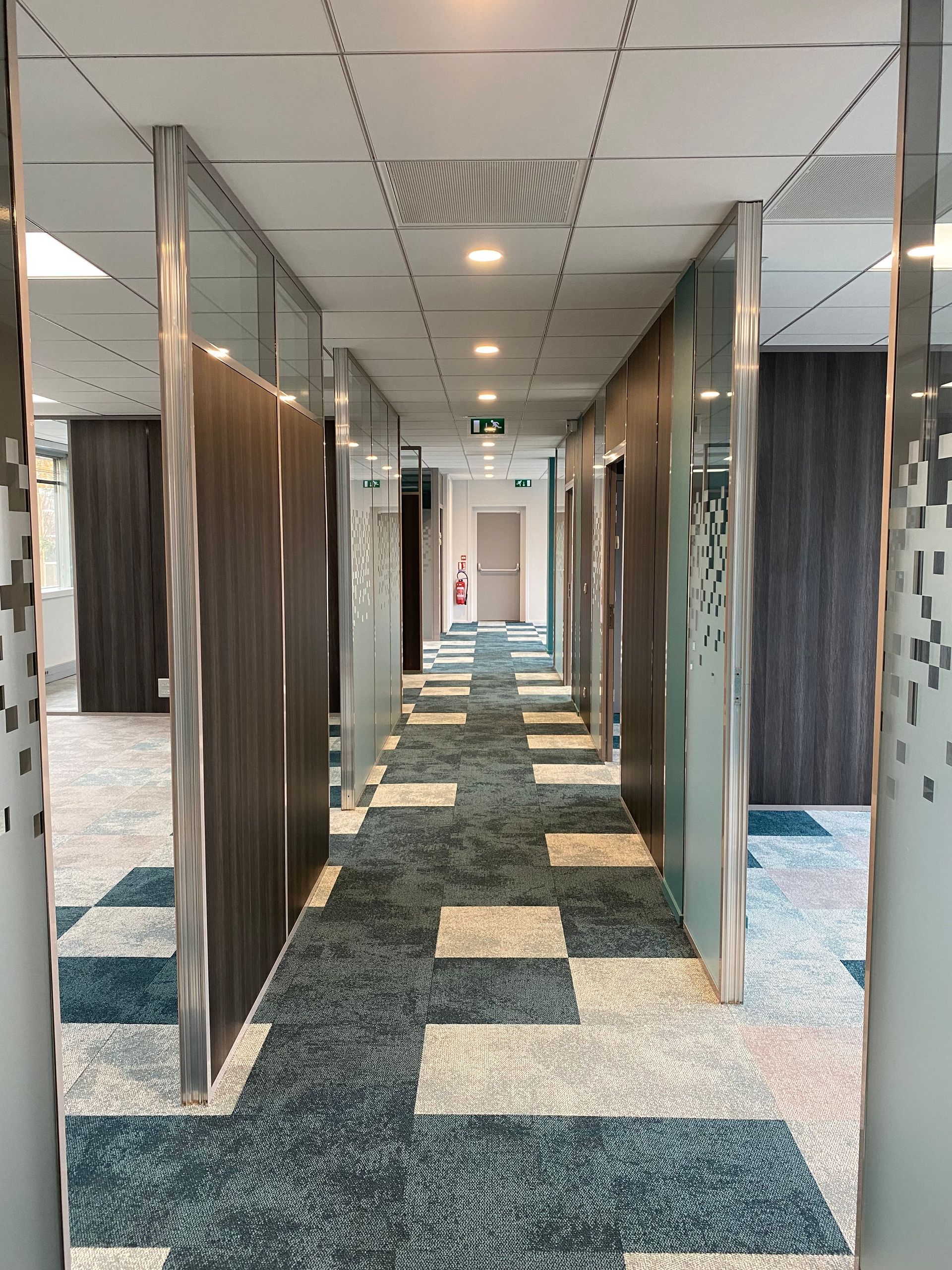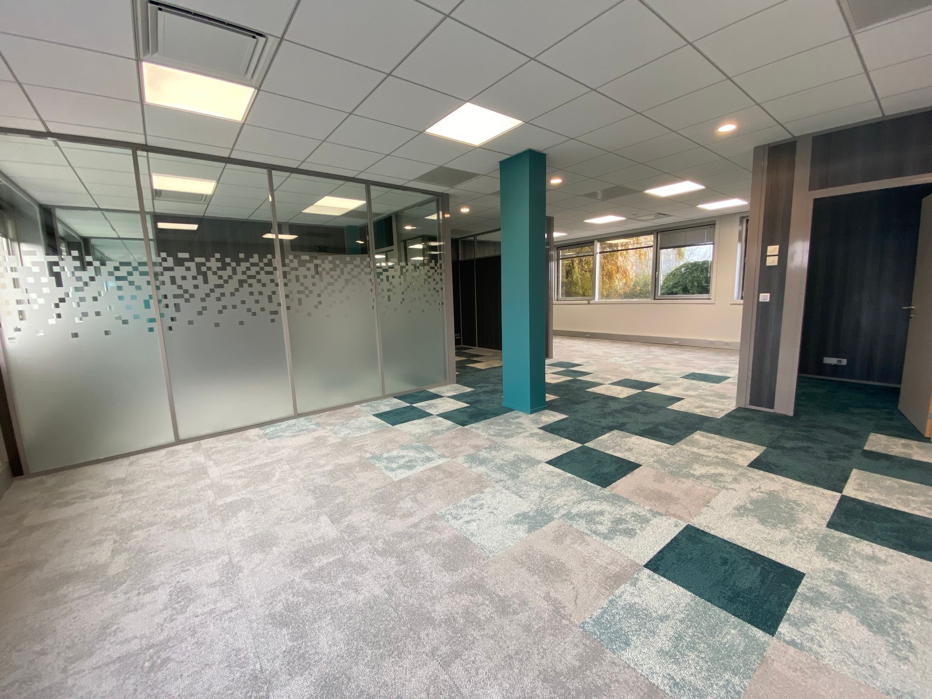 Réalisation des travaux de faux-plafonds, peinture et revêtements muraux pour la réfection des bureaux.